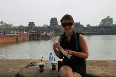 Overall, we were amazed by Siem Reap and Angkor Wat and would highly recommend it to anyone. Cambodia actually ended up becoming one our favorite destinations. The food was outstanding, the beer was always cold and we felt welcomed by the locals. In the picture above, ML is noshing on a favorite Cambodian treat, sticky rice - glutinous rice with coconut milk & red beans grilled in a bamboo husk - yummy!